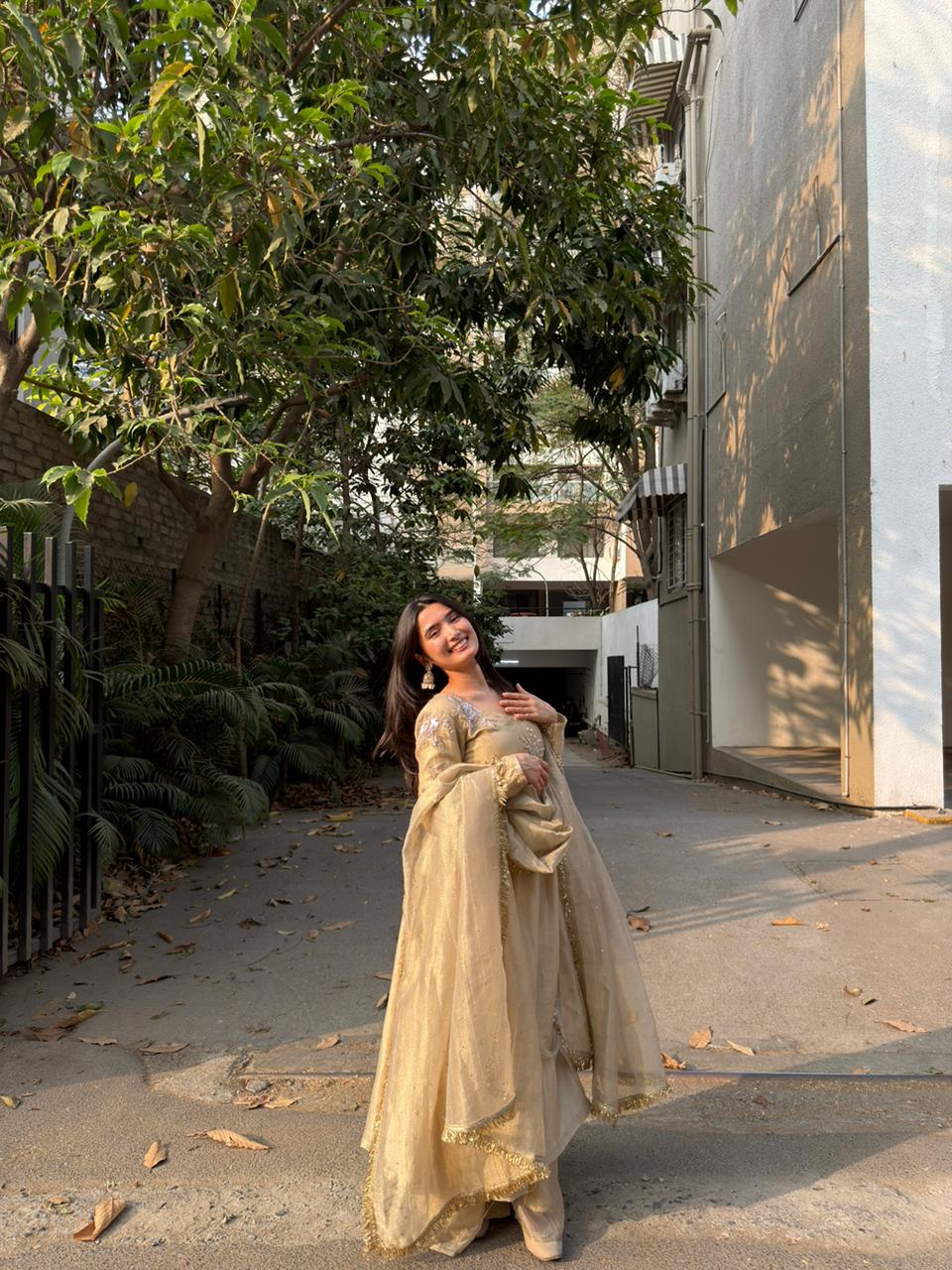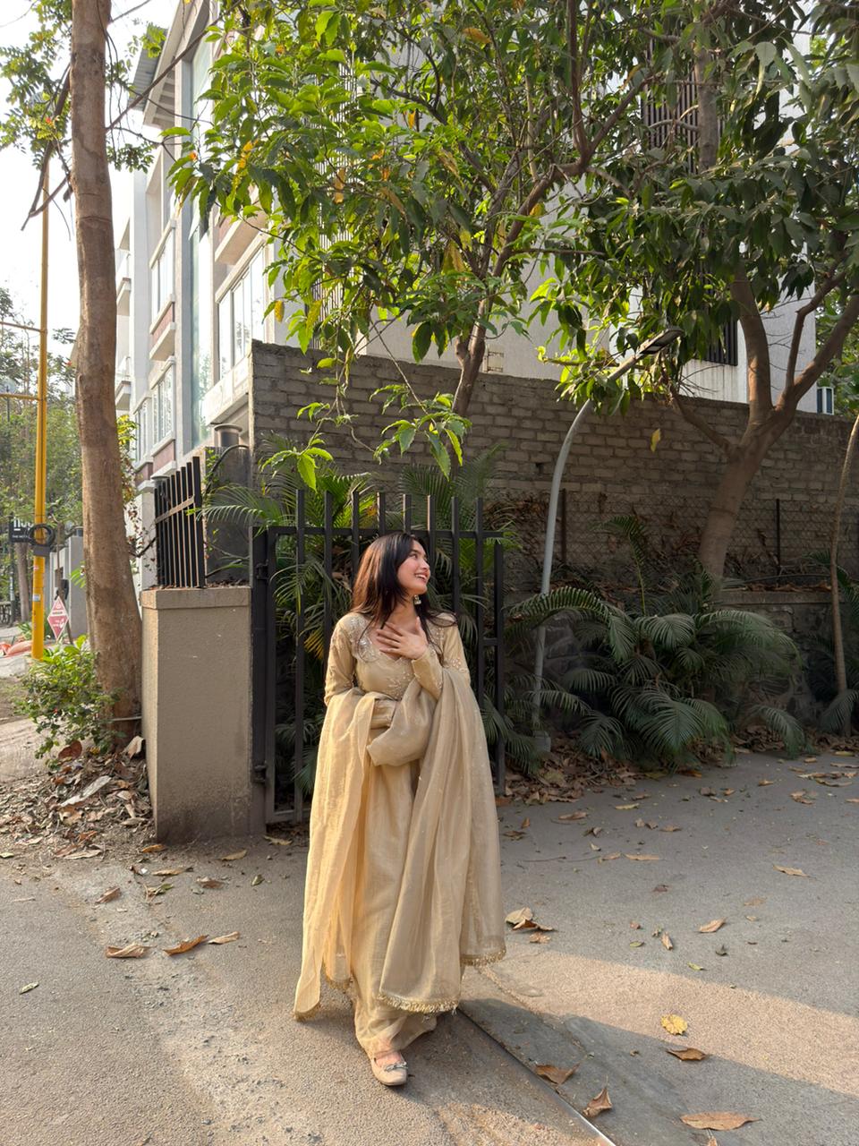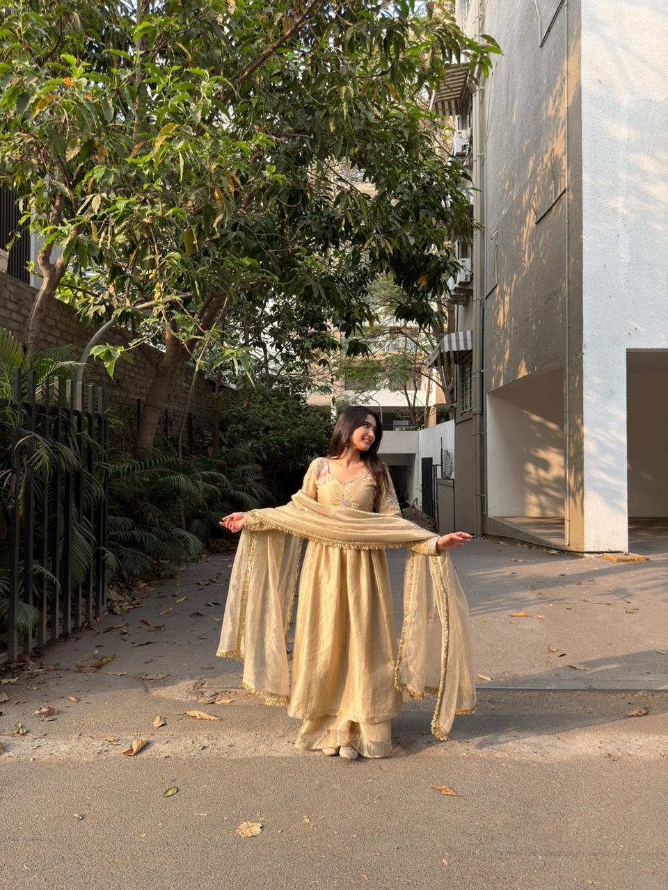 Step into timeless elegance with this Ivory Gold Anarkali Set, where classic charm meets refined luxury. Crafted in a soft ivory hue and enriched with delicate gold detailing, this ensemble exudes grace and sophistication. The flowing Anarkali silhouette creates a regal drape, enhancing movement while flattering every figure.